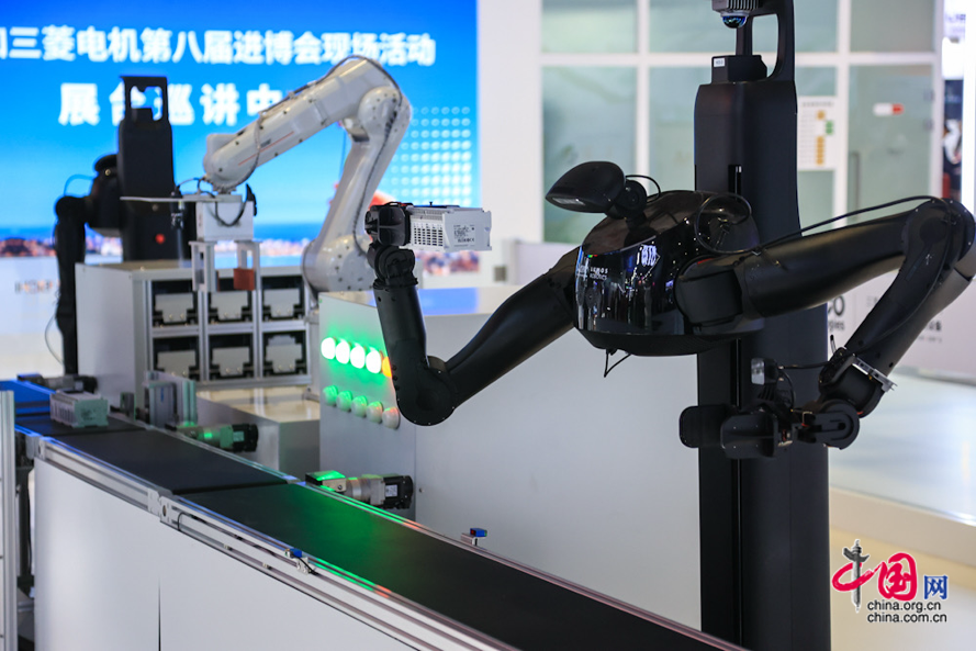 云帆智控公司展出具备双臂协同30公斤负载能力的电力具身智能机械人,它具备强大的动态均衡取协调能力,中国网记者 伦晓璇 摄
