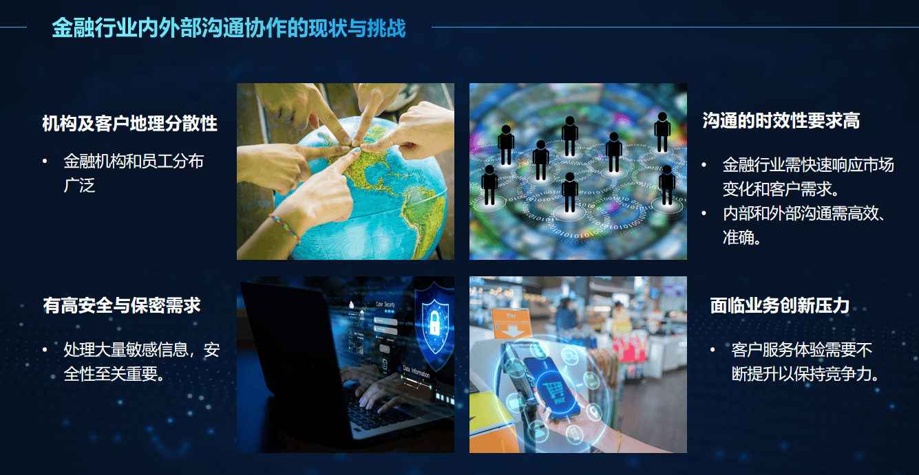 金融市场瞬息万变,厅堂微沙龙加强客户互动;新规明白要求金融营业沟通全程留痕、审计可逃溯,传输全程金融级加密,精准破解合规取效率难题,合规风险曲线. 沟通效率低下某大型金融机构摆设后!
