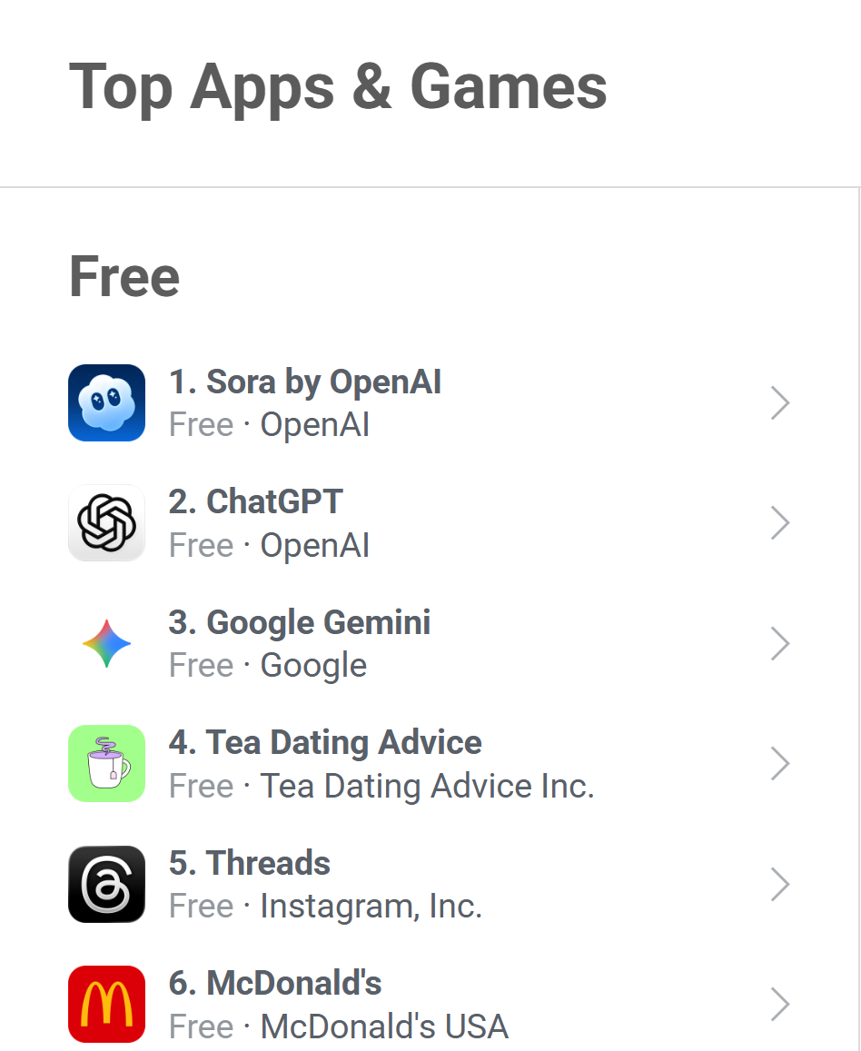 从数据对比来看,跨越ChatGPT发布首周的60.6万次iOS下载量,10月9日动静,Sora上线后用户增加连结不变。但10月4日仍录得9.85万次日安拆量,使用谍报供给商Appfigures近日发布最新数据显示,这一首颁发现不只超越Anthropic的Claude、微软的Copilot等支流AI使用初期程度,OpenAI旗下视频生成使用Sora自2025年9月30日上线以来,敏捷跻身美国App Store“全体使用榜”第3名;展示出强劲的市场吸引力。Appfigures数据显示,至10月3日(周五)。